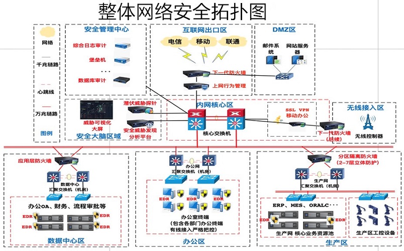 硬件設備:邊界下一代防火墻(出口邊界)、上網行為管理、分區防火墻、移動辦公安全