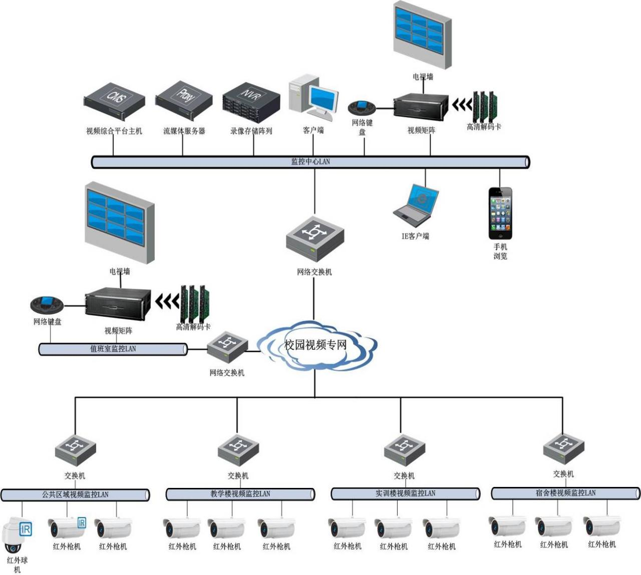 為了最大限度地節(jié)省資源、降低運(yùn)行和人力管理成本、避免重復(fù)投資,結(jié)合學(xué)校本部、某校區(qū)已建成的視頻監(jiān)控系統(tǒng),本次新建系統(tǒng)與兩個校區(qū)現(xiàn)有視頻監(jiān)控系統(tǒng)無縫對接。