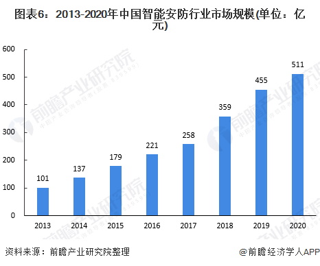 根據(jù)中安網(wǎng)《2020年中國安防行業(yè)調(diào)查報(bào)告》,2020年我國安防行業(yè)總產(chǎn)值為8510億元(其中安防產(chǎn)品總產(chǎn)值約為2600億元),根據(jù)2020年我國智能安防滲透率為6%測(cè)算,2020年我國智能安防市場(chǎng)規(guī)模約為511億元,2013-2020年市場(chǎng)規(guī)模年復(fù)合增長率達(dá)26%。
