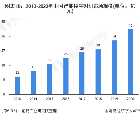近年來,隨著居民生活水平的提高,居民住宅小區(qū)的管理越來越規(guī)范和嚴(yán)謹(jǐn),居民對(duì)于樓宇對(duì)講系統(tǒng)的性能要求有所提升,不再局限于簡單的語音對(duì)講,而逐年向網(wǎng)絡(luò)化、可視化化發(fā)展。數(shù)據(jù)顯示,隨著樓宇對(duì)講系統(tǒng)的不斷升級(jí),樓宇對(duì)講智能化滲透率不斷提高,目前滲透率在20%左右。2019年中國樓宇對(duì)講系統(tǒng)市場(chǎng)規(guī)模為154億元,由此得出2019年中國智能樓宇對(duì)講市場(chǎng)規(guī)模約為34億元,2013-2019年復(fù)合增長率為20%。據(jù)估算,2020年市場(chǎng)規(guī)模約為40億元左右。